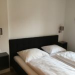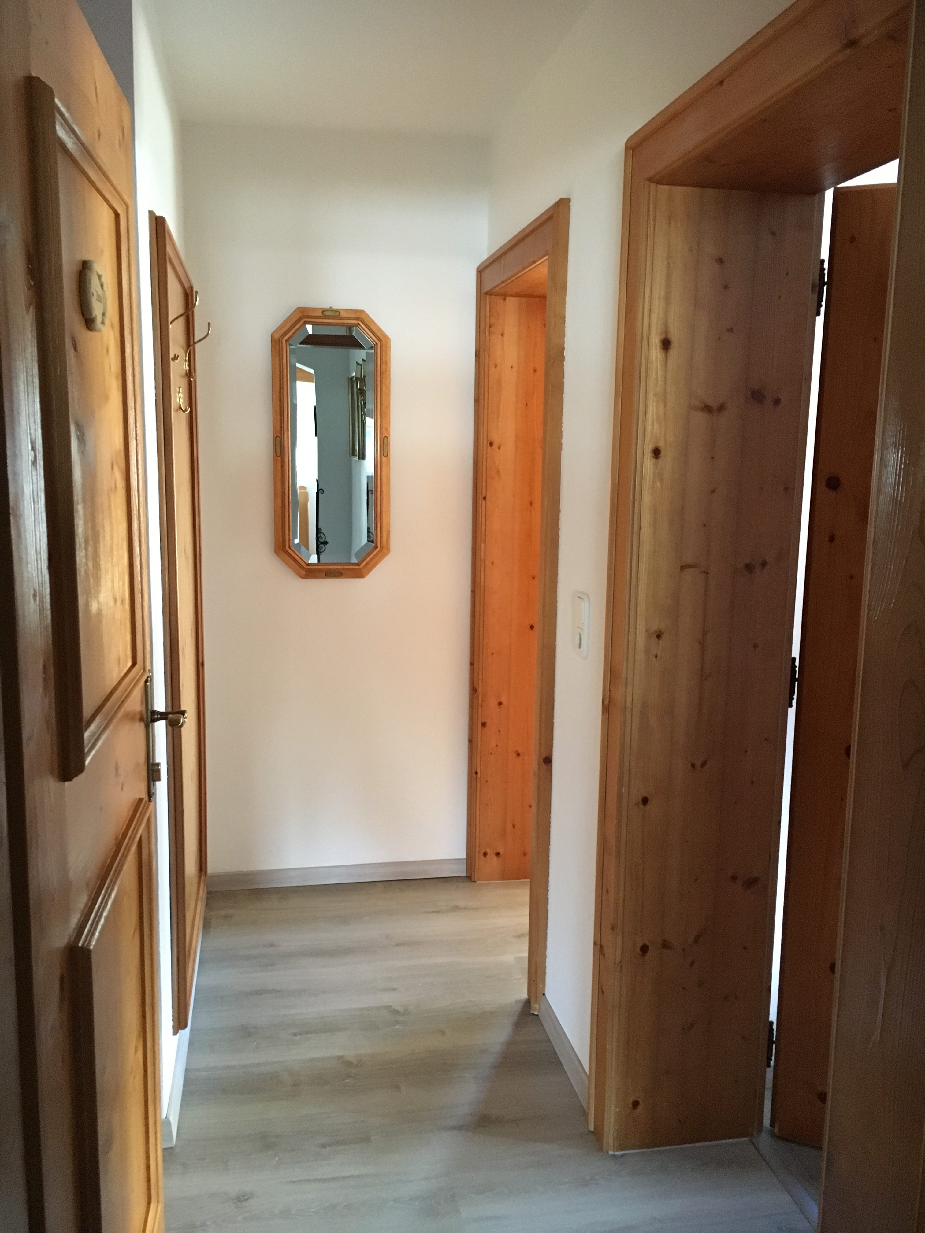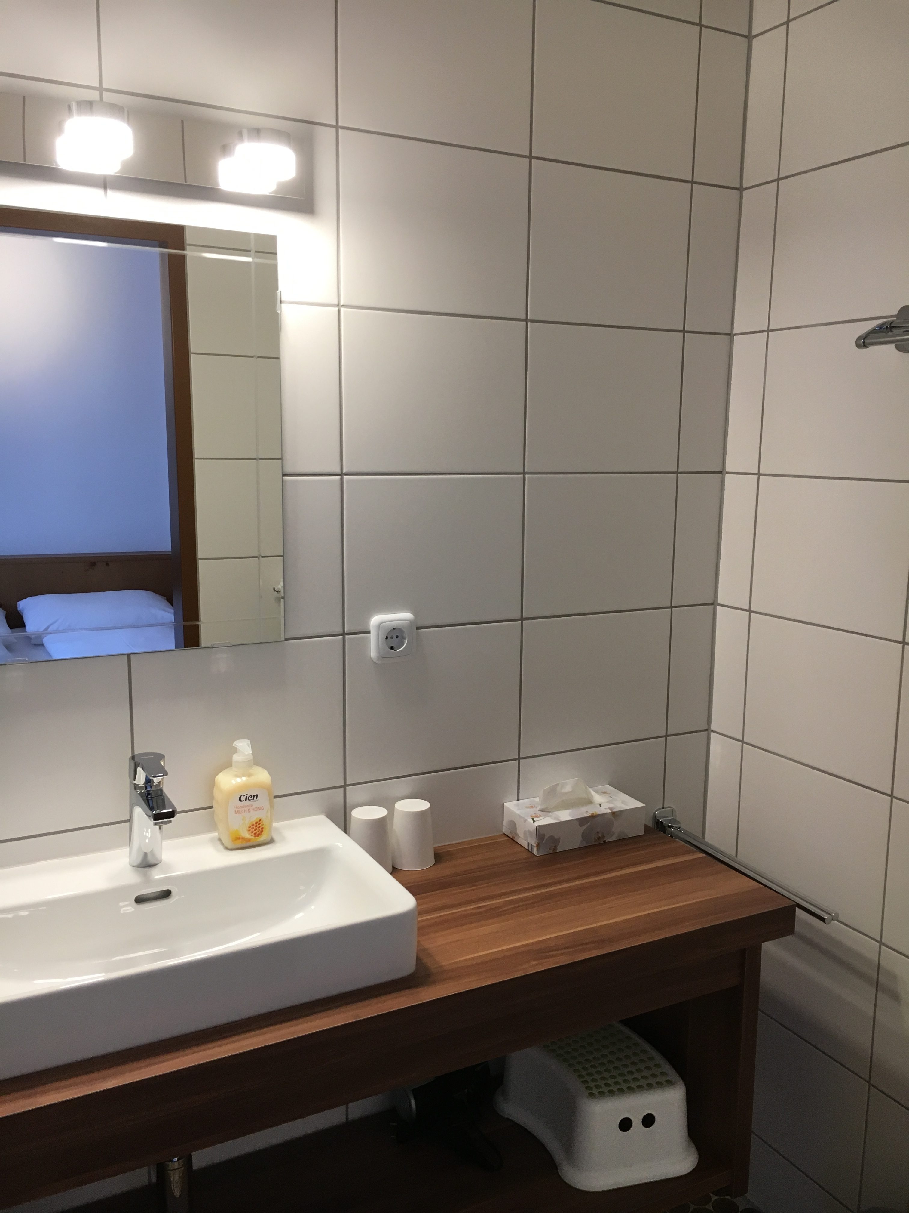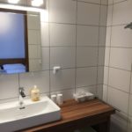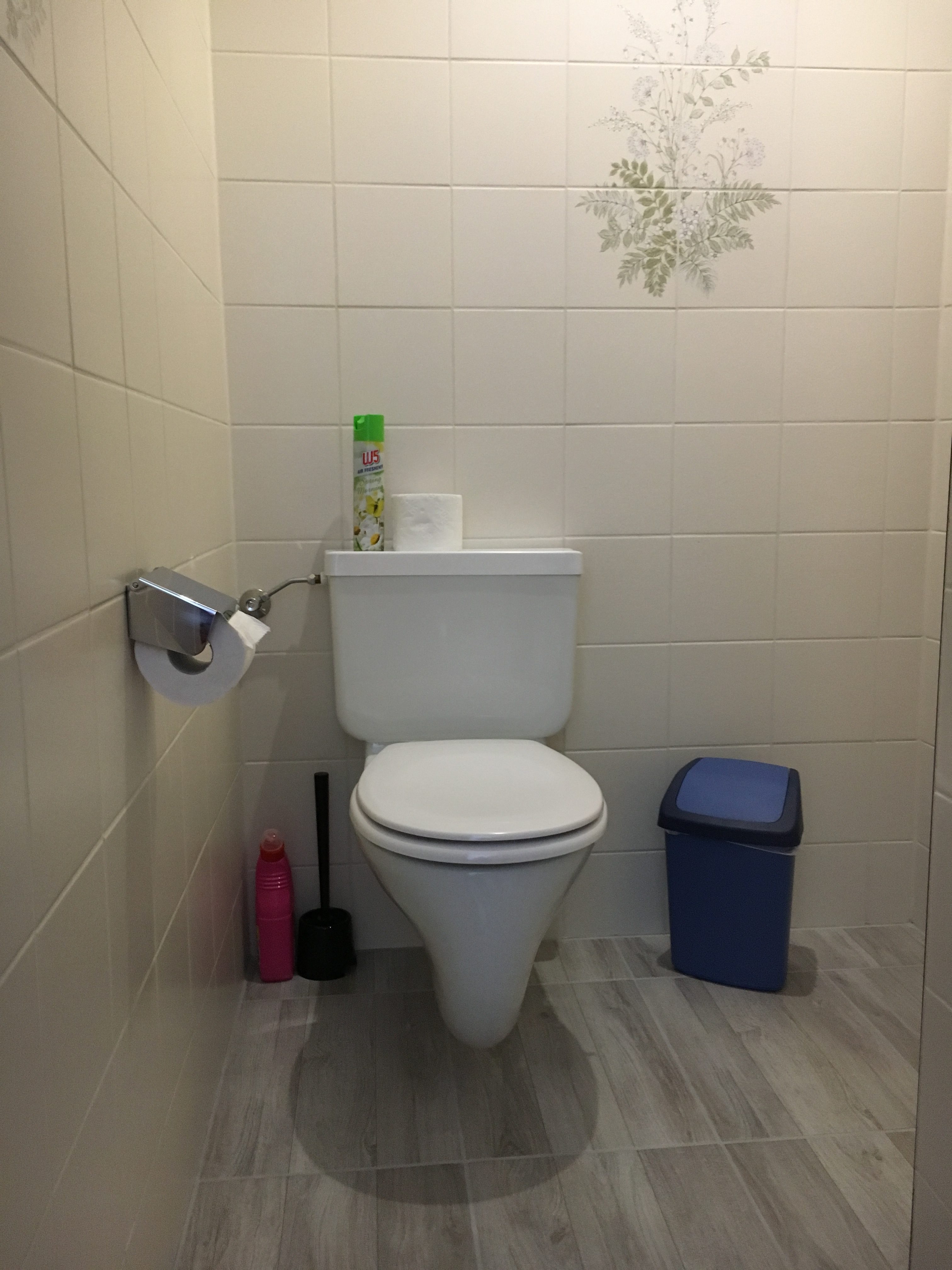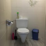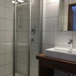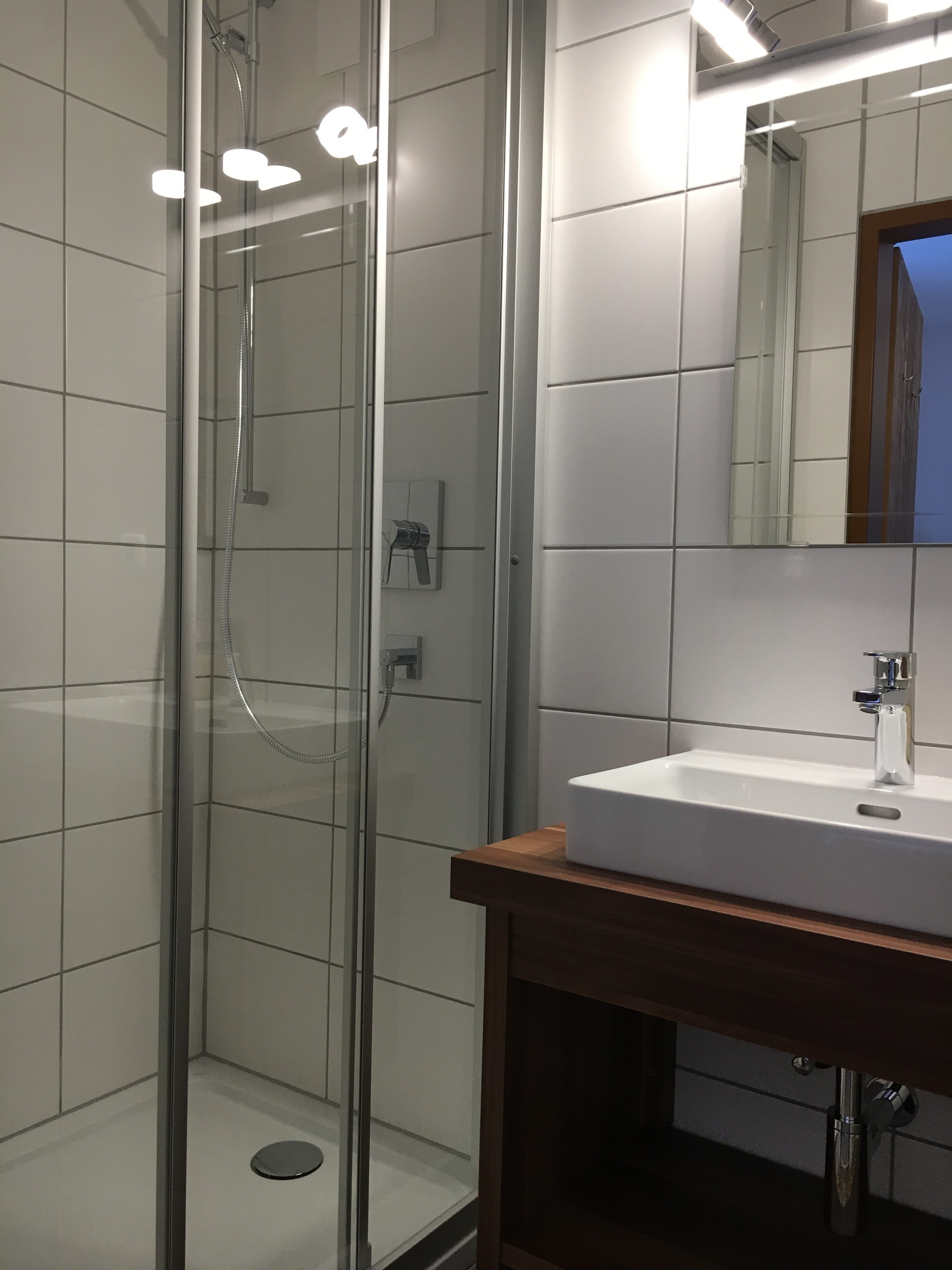 Nieuwe badkamer met douche, lavabo en haardroger, afzonderlijk toilet.