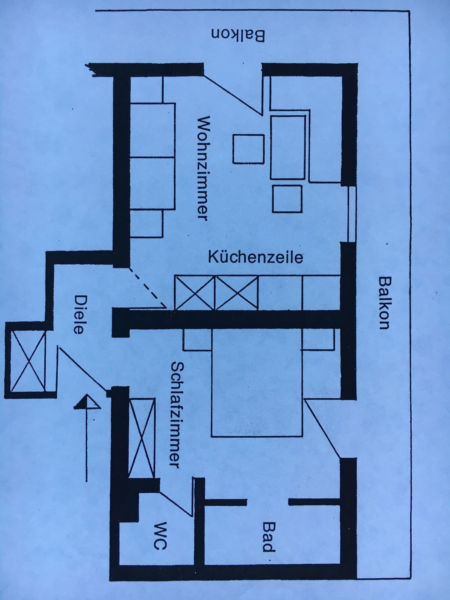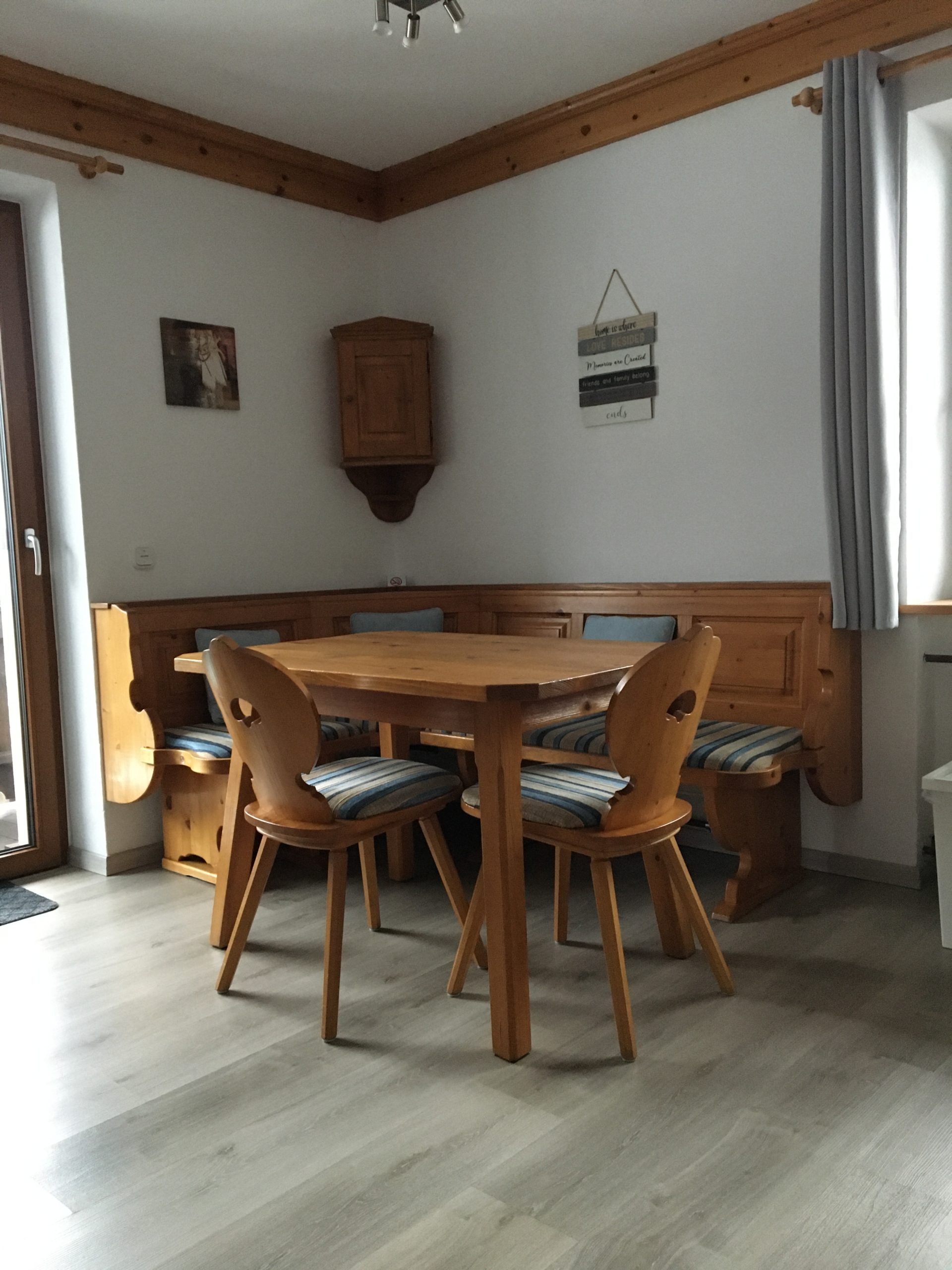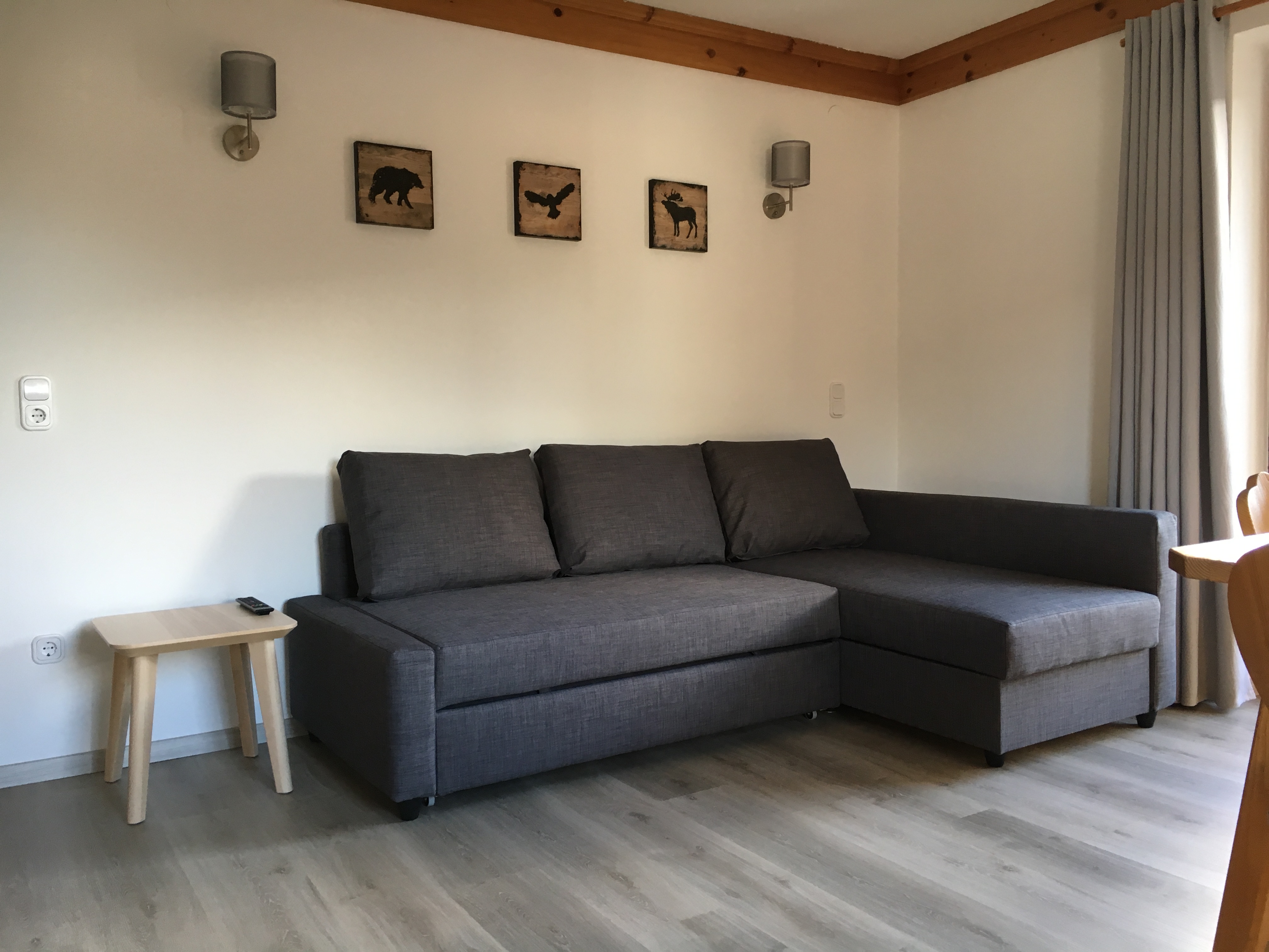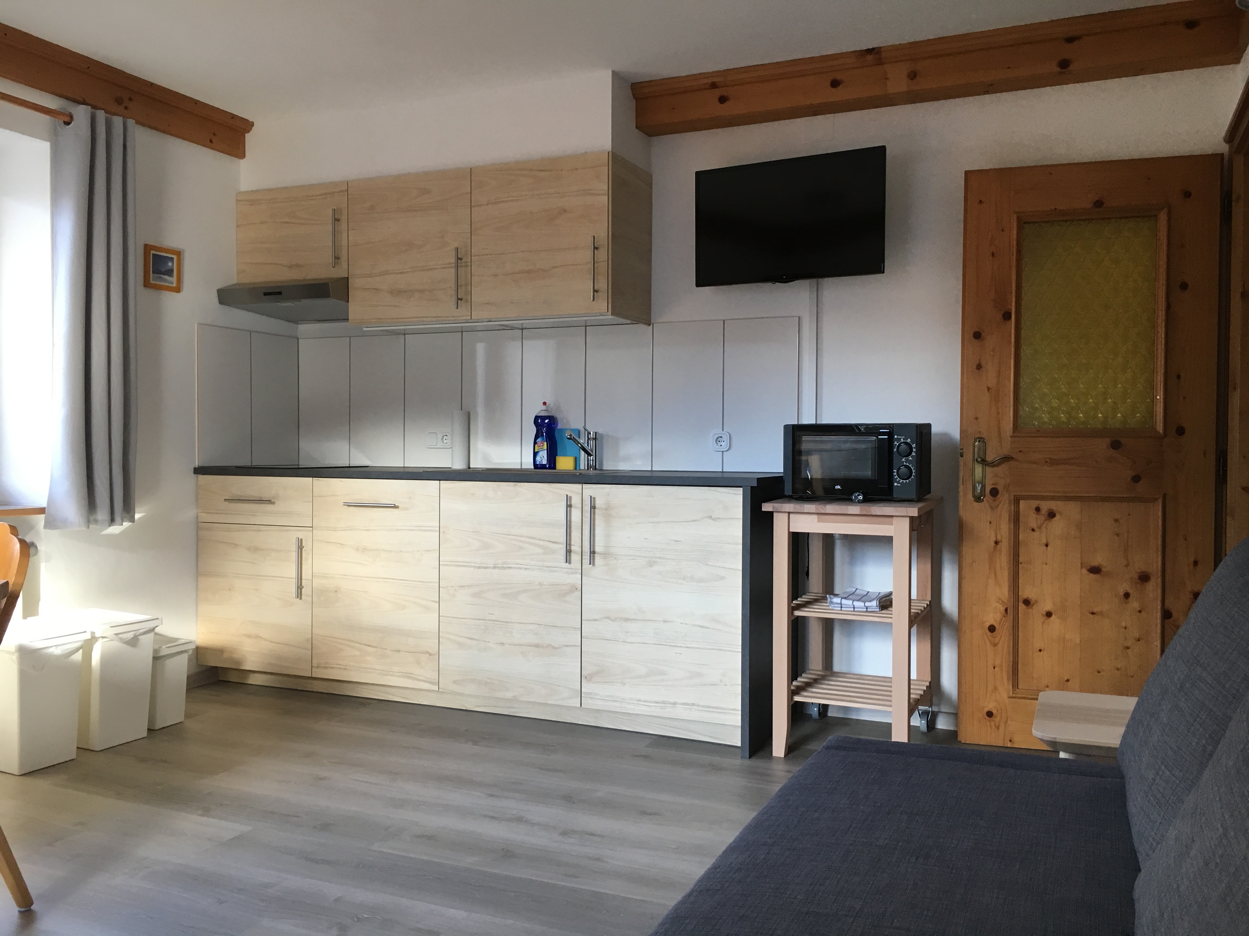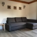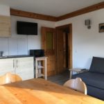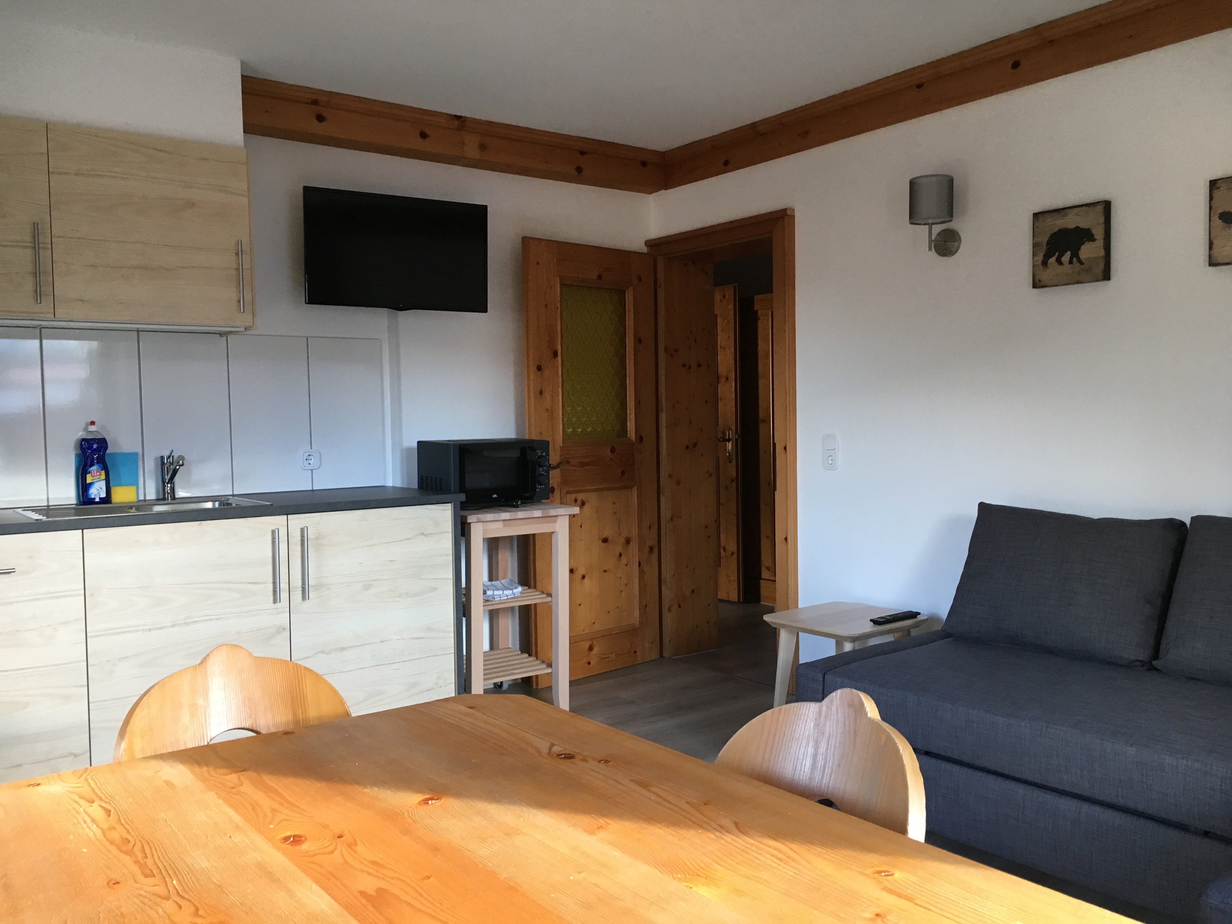 Woonkamer met keuken (incl vaatwasser), eethoek en 2-persoonssofabed.